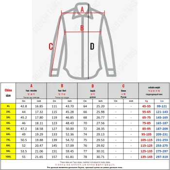 CHN XL (45-55kg), CHN 2XL (55-65kg), CHN 3XL (65-75kg), CHN 4XL (75-85kg), CHN 5XL (85-95kg), CHN 6XL (95-105kg), CHN 7XL (105-115kg), CHN 8XL (115-125kg), CHN 9XL (125-135kg), CHN 10XL (135-145kg)