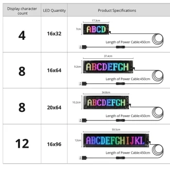 16×32 LEDs 7×17 CM, 16×64 LEDs 9×37 CM, 20×64 LEDs 10x35CM, 16×96 LEDs 12x60CM